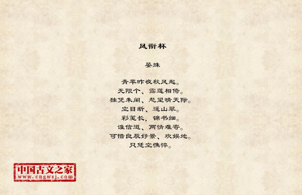 青苹昨夜秋风起。无限个、露莲相倚。独凭朱阑、愁望晴天际。空目断、遥山翠。彩笺长,锦书细。谁信道、两情难寄。可惜良辰好景、欢娱地。只恁空憔悴。