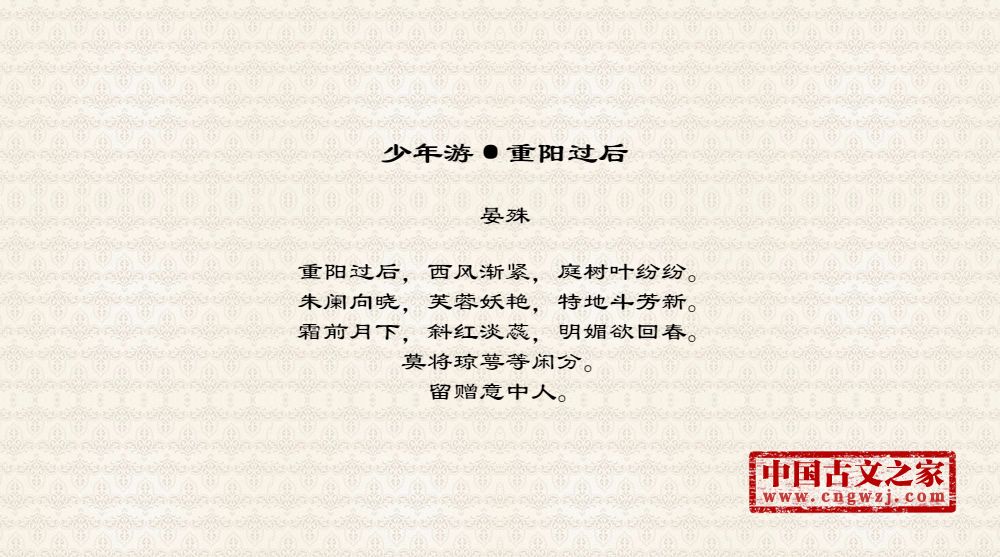 重阳过后,西风渐紧,庭树叶纷纷。朱阑向晓,芙蓉妖艳,特地斗芳新。霜前月下,斜红淡蕊,明媚欲回春。莫将琼萼等闲分。留赠意中人。
