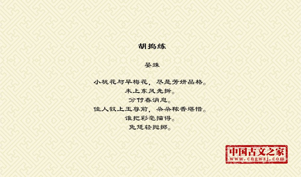 小桃花与早梅花,尽是芳妍品格。未上东风先拆。分付春消息。佳人钗上玉尊前,朵朵秾香堪惜。谁把彩毫描得。免恁轻抛掷。