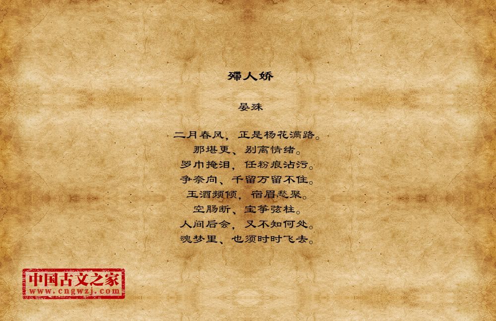 二月春风,正是杨花满路。那堪更、别离情绪。罗巾掩泪,任粉痕沾污。争奈向、千留万留不住。玉酒频倾,宿眉愁聚。空肠断、宝筝弦柱。人间后会,又不知何处。魂梦里、也须时时飞去。