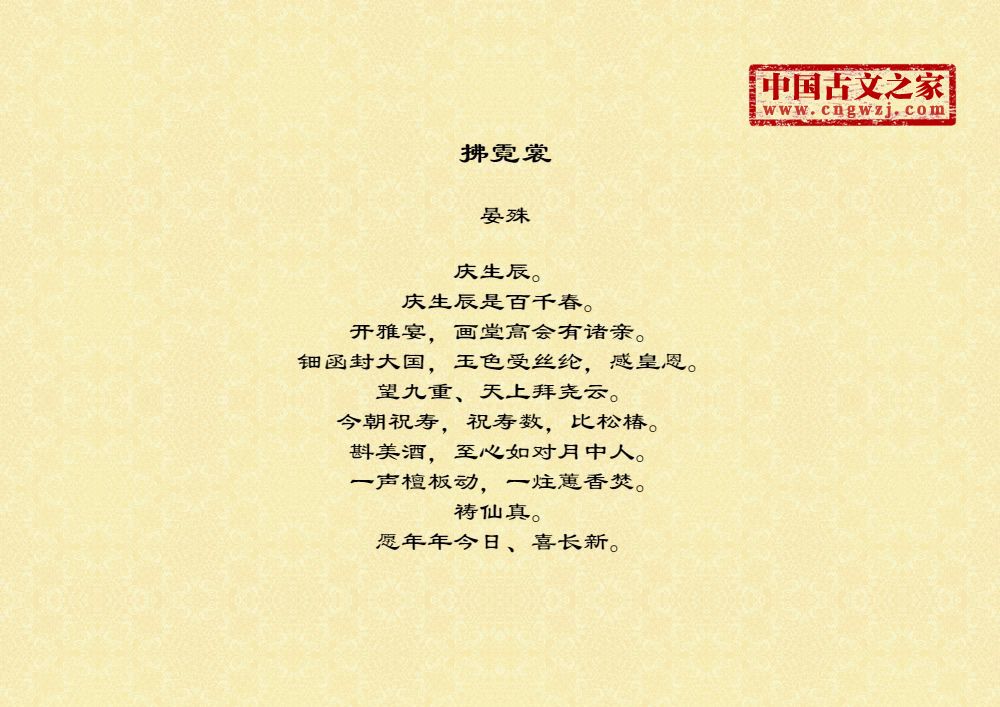 庆生辰。庆生辰是百千春。开雅宴,画堂高会有诸亲。钿函封大国,玉色受丝纶,感皇恩。望九重、天上拜尧云。今朝祝寿,祝寿数,比松椿。斟美酒,至心如对月中人。一声檀板动,一炷蕙香焚。祷仙真。愿年年今日、喜长新。