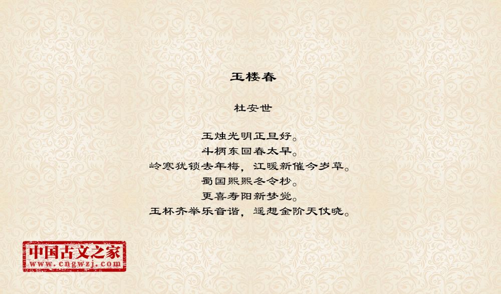 玉烛光明正旦好。斗柄东回春太早。岭寒犹锁去年梅,江暖新催今岁草。蜀国熙熙冬令杪。更喜寿阳新梦觉。玉杯齐举乐音谐,遥想金阶天仗晓。