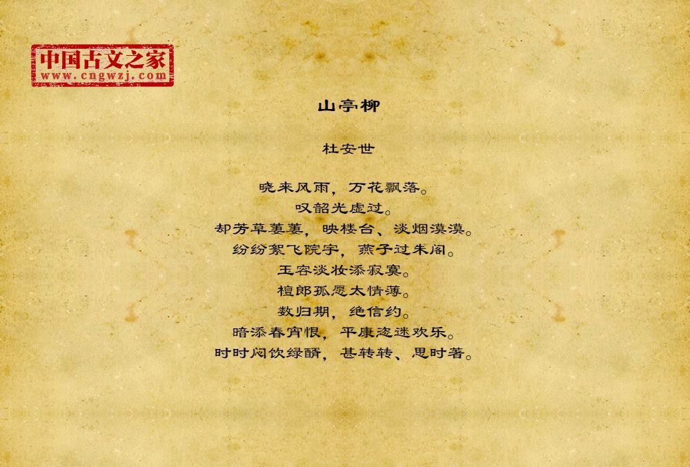 杜安世,生卒不详,京兆(今陕西西安)人。字寿域,(一作名寿,字安世)陈振孙《直斋书录解题》卷二一载《杜寿域词》一卷,谓“京兆杜安世撰,未详其人,词亦不