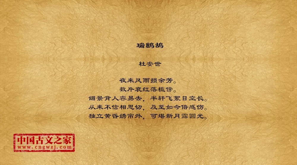 夜来风雨损余芳。数片衰红落槛傍。媚景背人容易去,半轩飞絮日空长。从来不信相思切,及至如今倍感伤。独立黄昏绣帘外,可堪新月露圆光。