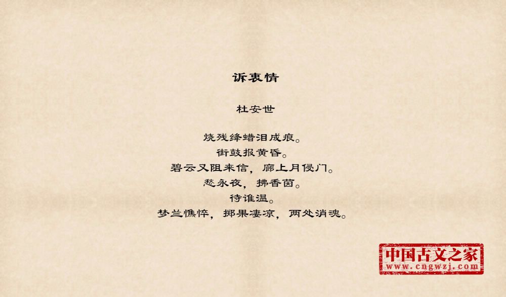 烧残绛蜡泪成痕。街鼓报黄昏。碧云又阻来信,廊上月侵门。愁永夜,拂香茵。待谁温。梦兰憔悴,掷果凄凉,两处消魂。