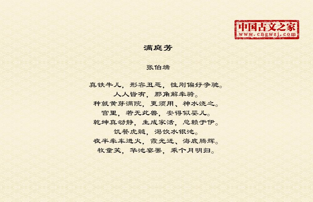 真铁牛儿,形容丑恶,性刚偏好争驰。人人皆有,那角解牵骑。种就黄芽满院,更须用、神水浇之。宫里,若无此兽,安得似婴儿。乾坤真动静,生成家活,总赖于伊。饥餐虎髓,渴饮水银池。夜半牵车进火,霞光迸、海底腾辉。牧童笑,华池宴罢,乘个月明归。