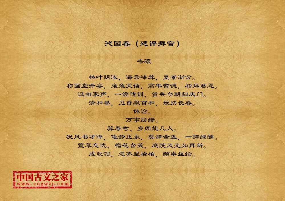 林叶阴浓,海云峰耸,夏景渐分。称画堂开宴,雍雍笑语,高年耆德,初拜君恩。汉相家声,一经传训,赏典今朝归庆门。清和昼,见香飘百和,乐按长春。休论。万事纷纭。算寿考、乡闾能几人。况凤书才降,龟龄正永,莫辞金盏,一醉醺醺。萱草忘忧,榴花含笑,庭院风光如再新。成欢颂,愿齐坚桧柏,频奉丝纶。
