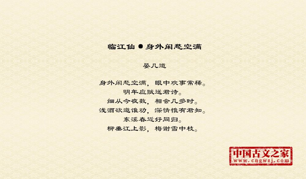 身外闲愁空满,眼中欢事常稀。明年应赋送君诗。细从今夜数,相会几多时。浅酒欲邀谁劝,深情惟有君知。东溪春近好同归。柳垂江上影,梅谢雪中枝。