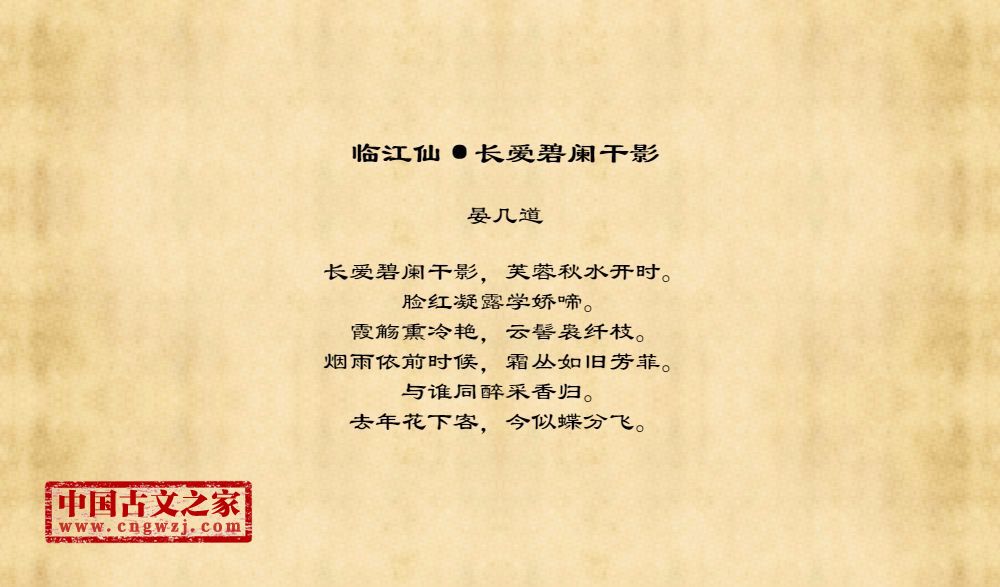 长爱碧阑干影,芙蓉秋水开时。脸红凝露学娇啼。霞觞熏冷艳,云髻袅纤枝。烟雨依前时候,霜丛如旧芳菲。与谁同醉采香归。去年花下客,今似蝶分飞。