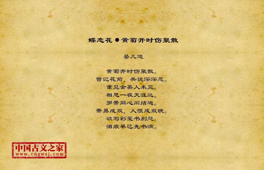 黄菊开时伤聚散。曾记花前,共说深深愿。重见金英人未见。相思一夜天涯远。罗带同心闲结遍。带易成双,人恨成双晚。欲写彩笺书别怨。泪痕早已先书满。