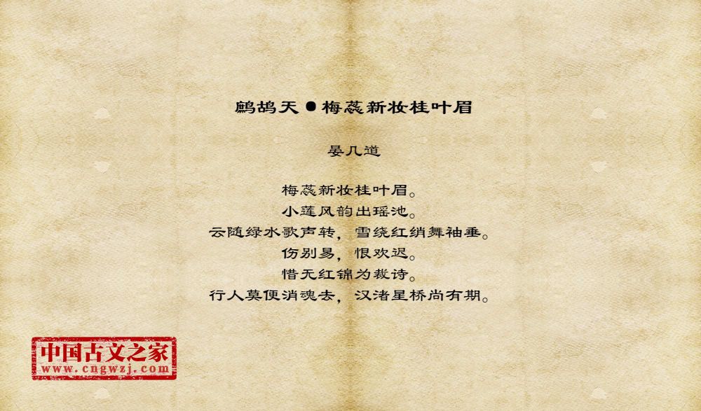 梅蕊新妆桂叶眉。小莲风韵出瑶池。云随绿水歌声转,雪绕红绡舞袖垂。伤别易,恨欢迟。惜无红锦为裁诗。行人莫便消魂去,汉渚星桥尚有期。