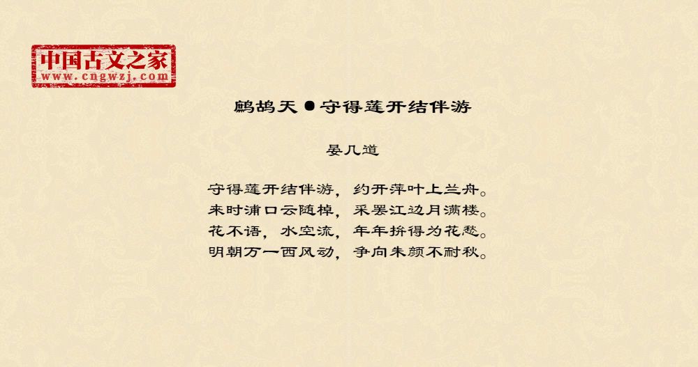 守得莲开结伴游,约开萍叶上兰舟。来时浦口云随棹,采罢江边月满楼。花不语,水空流,年年拚得为花愁。明朝万一西风动,争向朱颜不耐秋。