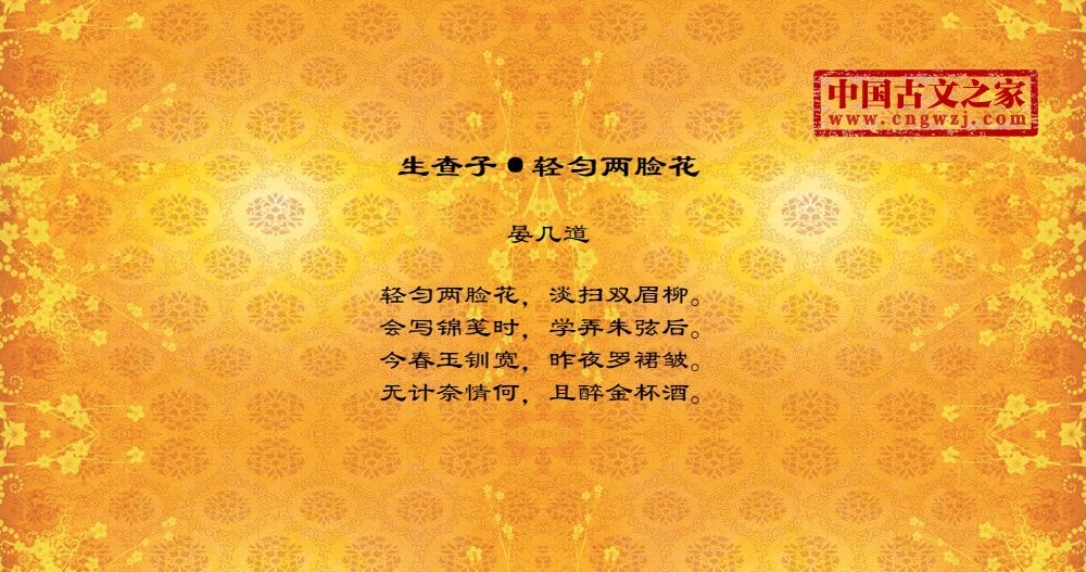 轻匀两脸花,淡扫双眉柳。会写锦笺时,学弄朱弦后。今春玉钏宽,昨夜罗裙皱。无计奈情何,且醉金杯酒。