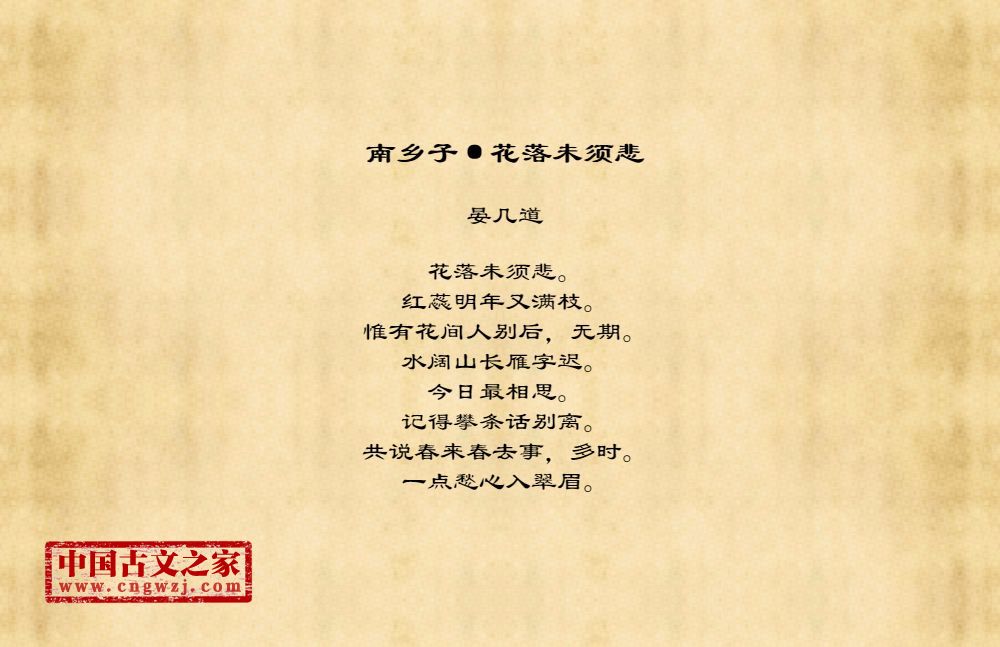 花落未须悲。红蕊明年又满枝。惟有花间人别后,无期。水阔山长雁字迟。今日最相思。记得攀条话别离。共说春来春去事,多时。一点愁心入翠眉。
