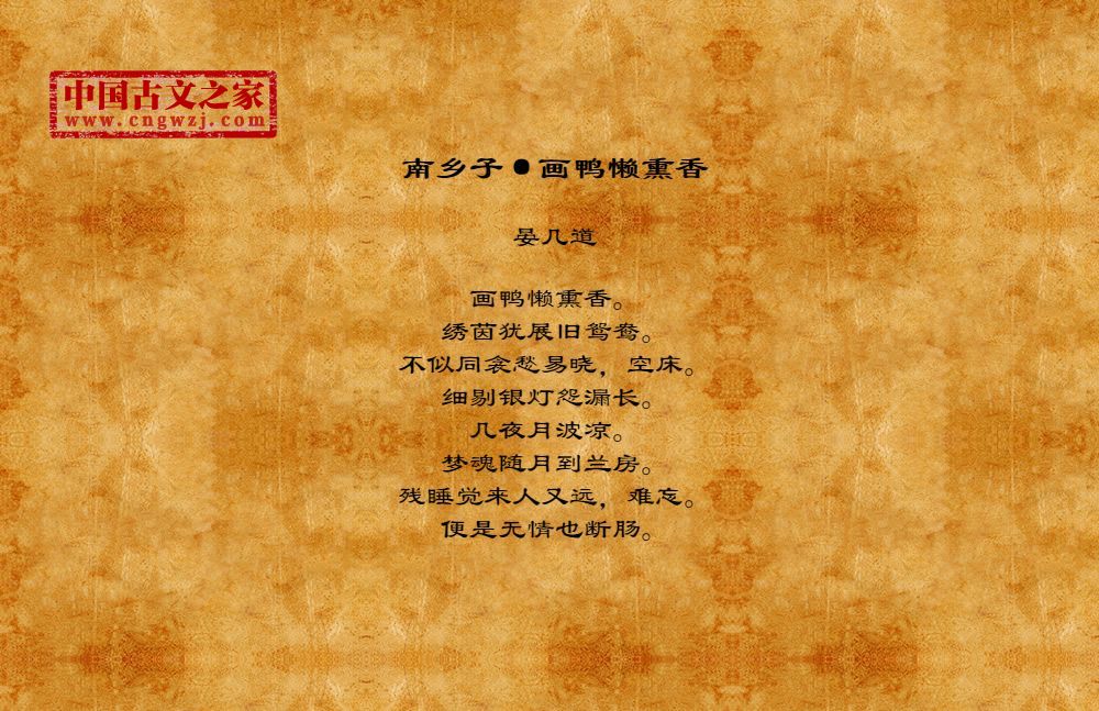 画鸭懒熏香。绣茵犹展旧鸳鸯。不似同衾愁易晓,空床。细剔银灯怨漏长。几夜月波凉。梦魂随月到兰房。残睡觉来人又远,难忘。便是无情也断肠。