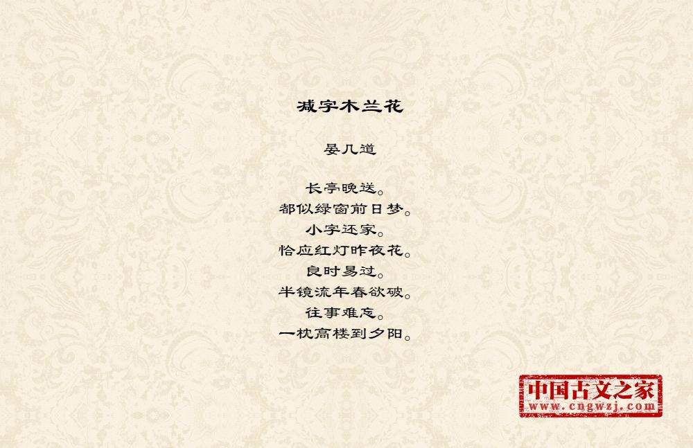长亭晚送。都似绿窗前日梦。小字还家。恰应红灯昨夜花。良时易过。半镜流年春欲破。往事难忘。一枕高楼到夕阳。