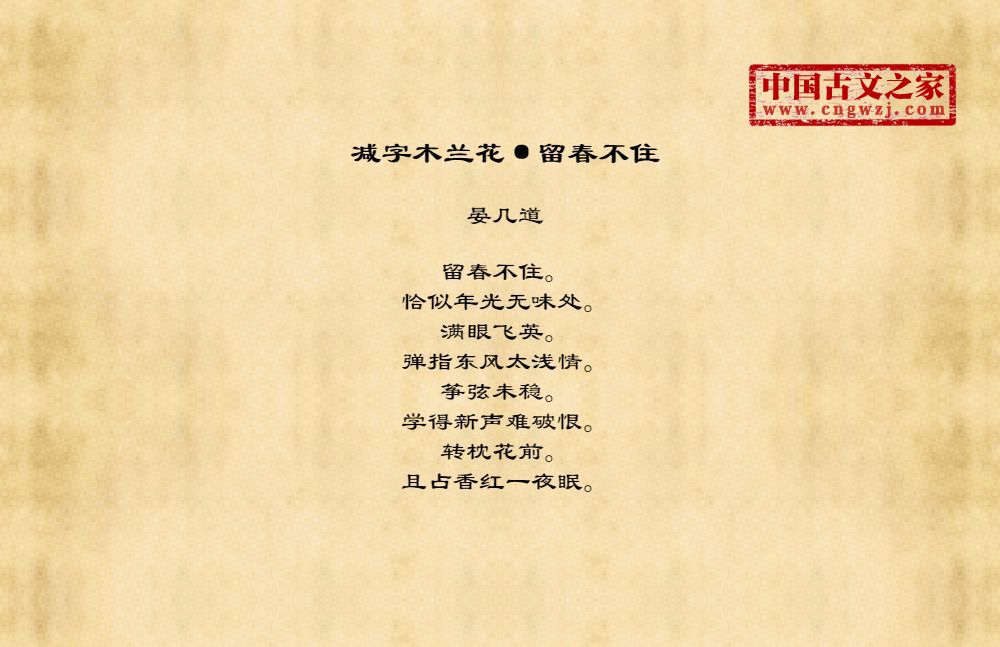 留春不住。恰似年光无味处。满眼飞英。弹指东风太浅情。筝弦未稳。学得新声难破恨。转枕花前。且占香红一夜眠。
