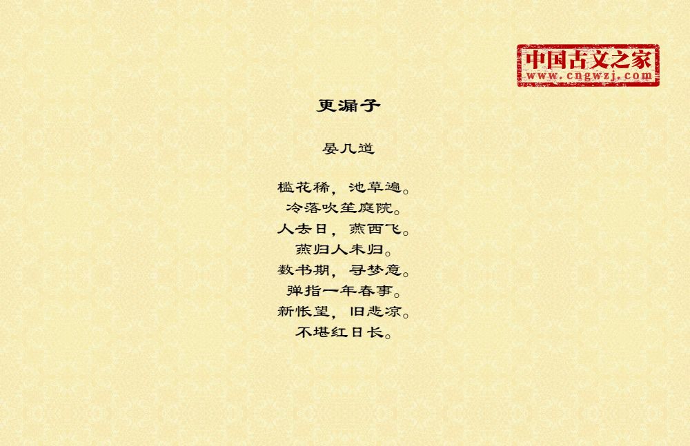 槛花稀,池草遍。冷落吹笙庭院。人去日,燕西飞。燕归人未归。数书期,寻梦意。弹指一年春事。新怅望,旧悲凉。不堪红日长。