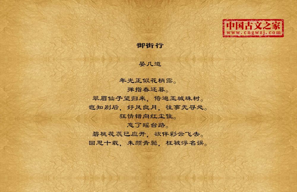 年光正似花梢露。弹指春还暮。翠眉仙子望归来,倚遍玉城珠树。岂知别后,好风良月,往事无寻处。狂情错向红尘住。忘了瑶台路。碧桃花蕊已应开,欲伴彩云飞去。回思十载,朱颜青鬓,枉被浮名误。