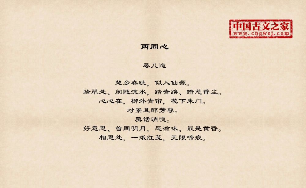 楚乡春晚,似入仙源。拾翠处、闲随流水,踏青路、暗惹香尘。心心在,柳外青帘,花下朱门。对景且醉芳尊。莫话消魂。好意思、曾同明月,恶滋味、最是黄昏。相思处,一纸红笺,无限啼痕。