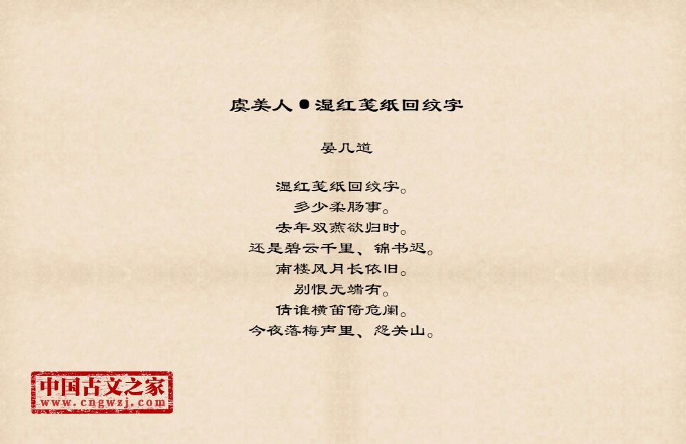 湿红笺纸回纹字。多少柔肠事。去年双燕欲归时。还是碧云千里、锦书迟。南楼风月长依旧。别恨无端有。倩谁横笛倚危阑。今夜落梅声里、怨关山。