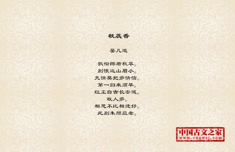 歌彻郎君秋草。别恨远山眉小。无情莫把多情恼。第一归来须早。红尘自古长安道。故人多。相思不比相逢好。此别朱颜应老。