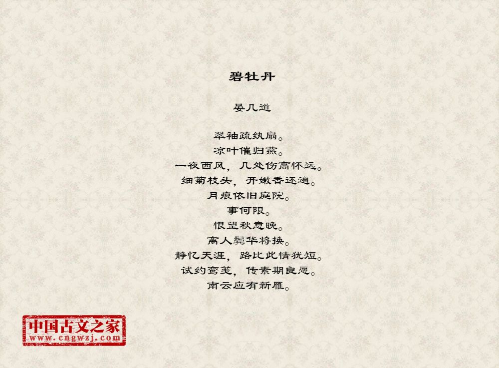 翠袖疏纨扇。凉叶催归燕。一夜西风,几处伤高怀远。细菊枝头,开嫩香还遍。月痕依旧庭院。事何限。恨望秋意晚。离人鬓华将换。静忆天涯,路比此情犹短。试约鸾笺,传素期良愿。南云应有新雁。