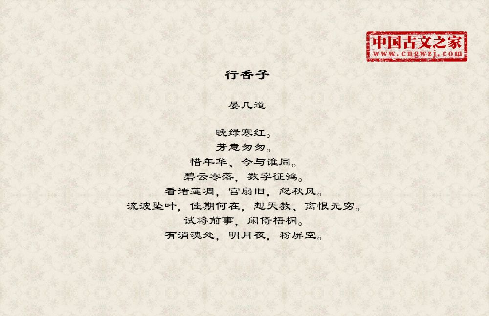 晚绿寒红。芳意匆匆。惜年华、今与谁同。碧云零落,数字征鸿。看渚莲凋,宫扇旧,怨秋风。流波坠叶,佳期何在,想天教、离恨无穷。试将前事,闲倚梧桐。有消魂处,明月夜,粉屏空。