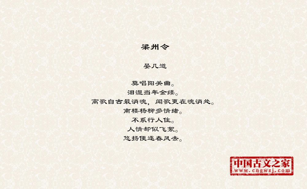 莫唱阳关曲。泪湿当年金缕。离歌自古最消魂,闻歌更在魂消处。南楼杨柳多情绪。不系行人住。人情却似飞絮。悠扬便逐春风去。