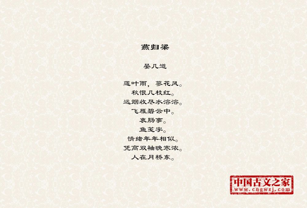 莲叶雨,蓼花风。秋恨几枝红。远烟收尽水溶溶。飞雁碧云中。衷肠事。鱼笺字。情绪年年相似。凭高双袖晚寒浓。人在月桥东。