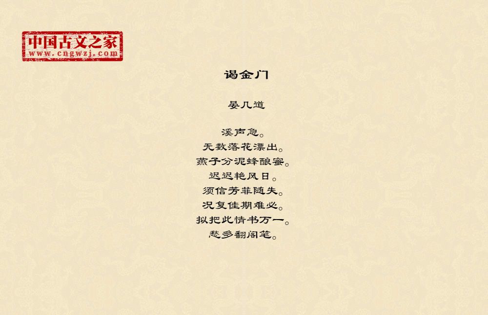 溪声急。无数落花漂出。燕子分泥蜂酿蜜。迟迟艳风日。须信芳菲随失。况复佳期难必。拟把此情书万一。愁多翻阁笔。