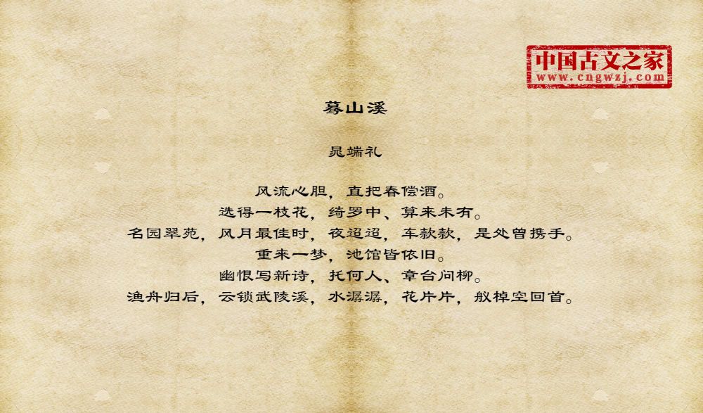 风流心胆,直把春偿酒。选得一枝花,绮罗中、算来未有。名园翠苑,风月最佳时,夜迢迢,车款款,是处曾携手。重来一梦,池馆皆依旧。幽恨写新诗,托何人、章台问柳。渔舟归后,云锁武陵溪,水潺潺,花片片,舣棹空回首。
