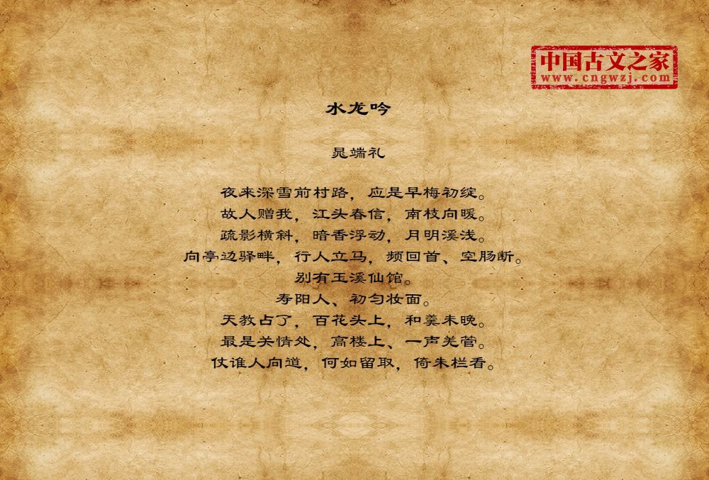 夜来深雪前村路,应是早梅初绽。故人赠我,江头春信,南枝向暖。疏影横斜,暗香浮动,月明溪浅。向亭边驿畔,行人立马,频回首、空肠断。别有玉溪仙馆。寿阳人、初匀妆面。天教占了,百花头上,和羹未晚。最是关情处,高楼上、一声羌管。仗谁人向道,何如留取,倚朱栏看。