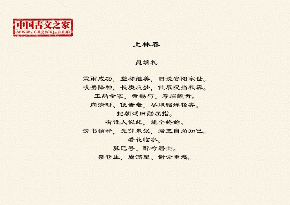 霖雨成功,堂称继美,旧说安阳家世。峻岳降神,长庚应梦,佳辰况当秋霁。玉函金篆,帝锡与、寿眉齯齿。向清时、便告老,尽取貂蝉轻弃。把朝廷旧勋屈指。有谁人似此,能全终始。谤书顿释,先芬未泯,君王自为知己。看花临水。算已号、醉吟居士。奈苍生,尚满望、谢公重起。