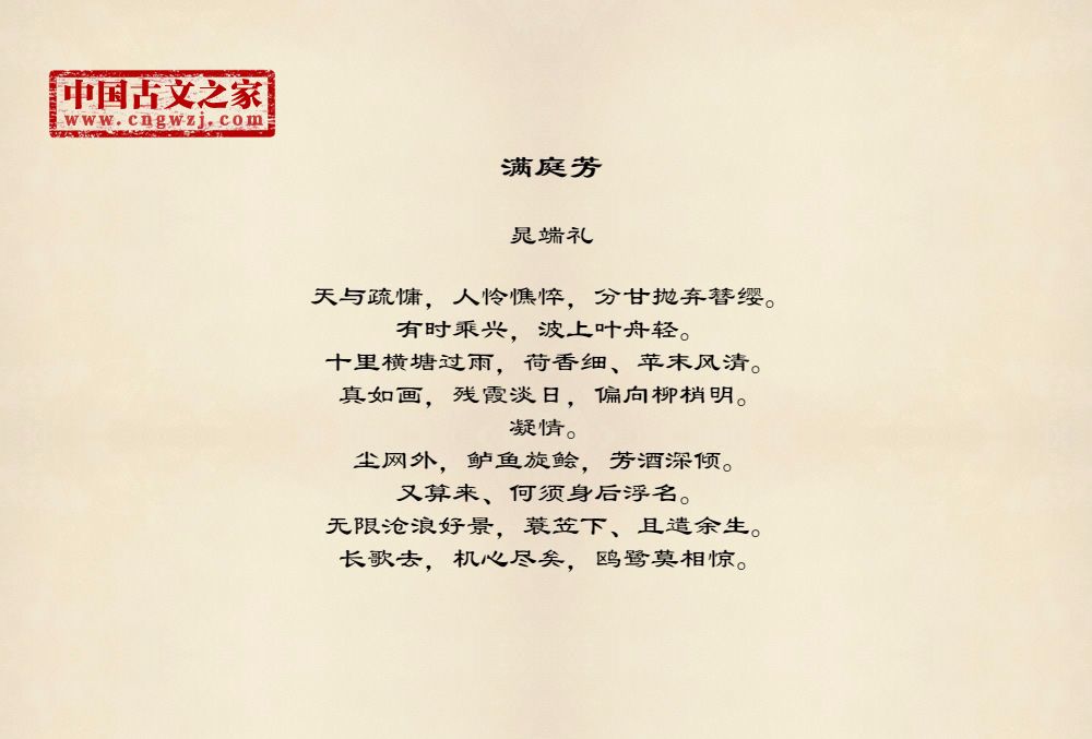 天与疏慵,人怜憔悴,分甘抛弃簪缨。有时乘兴,波上叶舟轻。十里横塘过雨,荷香细、苹末风清。真如画,残霞淡日,偏向柳梢明。凝情。尘网外,鲈鱼旋鲙,芳酒深倾。又算来、何须身后浮名。无限沧浪好景,蓑笠下、且遣余生。长歌去,机心尽矣,鸥鹭莫相惊。