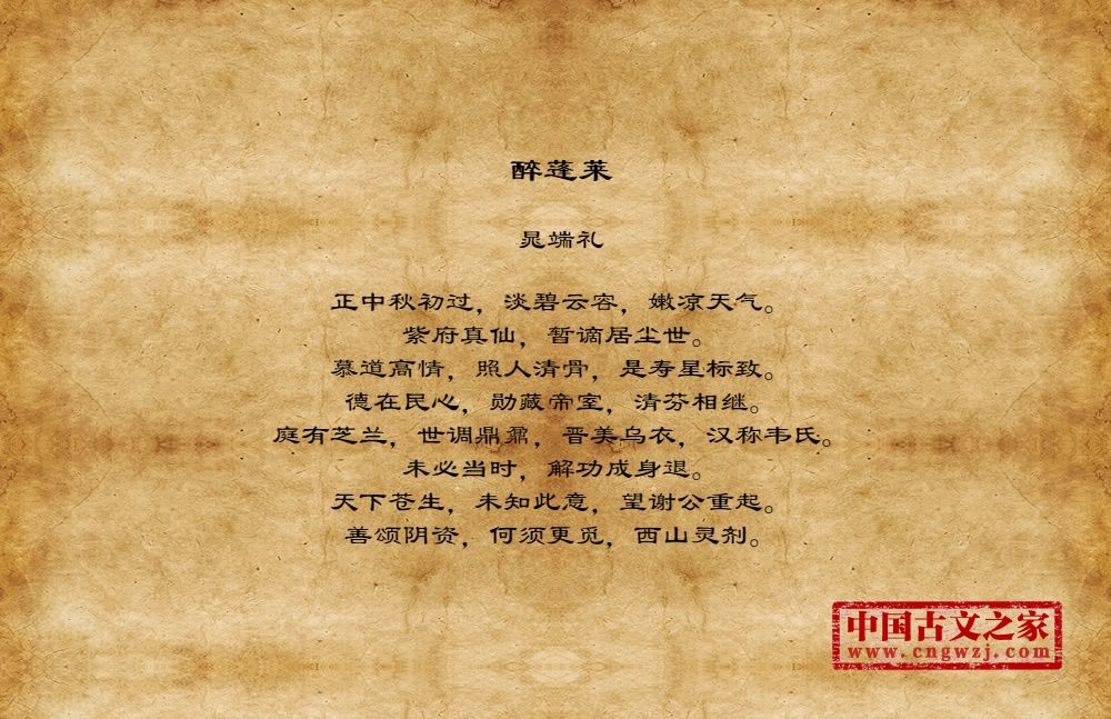 正中秋初过,淡碧云容,嫩凉天气。紫府真仙,暂谪居尘世。慕道高情,照人清骨,是寿星标致。德在民心,勋藏帝室,清芬相继。庭有芝兰,世调鼎鼐,晋美乌衣,汉称韦氏。未必当时,解功成身退。天下苍生,未知此意,望谢公重起。善颂阴资,何须更觅,西山灵剂。