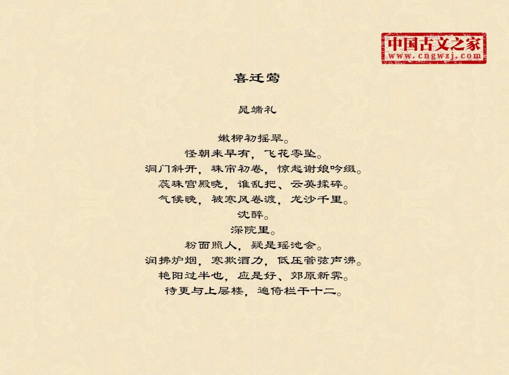 嫩柳初摇翠。怪朝来早有,飞花零坠。洞门斜开,珠帘初卷,惊起谢娘吟缀。蕊珠宫殿晓,谁乱把、云英揉碎。气候晚,被寒风卷渡,龙沙千里。沈醉。深院里。粉面照人,疑是瑶池会。润拂炉烟,寒欺酒力,低压管弦声沸。艳阳过半也,应是好、郊原新霁。待更与上层楼,遍倚栏干十二。