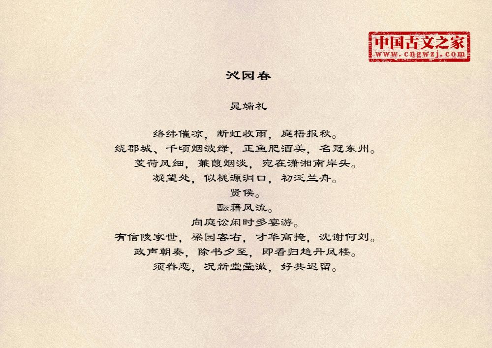络纬催凉,断虹收雨,庭梧报秋。绕郡城、千顷烟波绿,正鱼肥酒美,名冠东州。芰荷风细,蒹葭烟淡,宛在潇湘南岸头。凝望处,似桃源洞口,初泛兰舟。贤侯。酝藉风流。向庭讼闲时多宴游。有信陵家世,梁园客右,才华高掩,沈谢何刘。政声朝奏,除书夕至,即看归趋丹凤楼。须眷恋,况新堂莹澈,好共迟留。