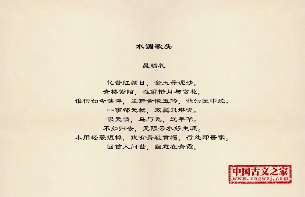 忆昔红颜日,金玉等泥沙。青楼紫陌,惟解惜月与贪花。谁信如今憔悴,尘暗金徽玉轸,藓污匣中蛇。一事都无就,双鬓只堪嗟。恨无情,乌与兔,送年华。不如归去,无限云水好生涯。未用轻蓑短棹,犹有青鞋黄帽,行处即吾家。回首人间世,幽意在青霞。