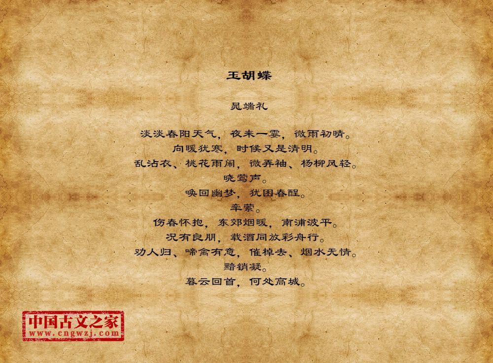 淡淡春阳天气,夜来一霎,微雨初晴。向暖犹寒,时候又是清明。乱沾衣、桃花雨闹,微弄袖、杨柳风轻。晓莺声。唤回幽梦,犹困春酲。牵萦。伤春怀抱,东郊烟暖,南浦波平。况有良朋,载酒同放彩舟行。劝人归、啼禽有意,催棹去、烟水无情。黯销凝。暮云回首,何处高城。