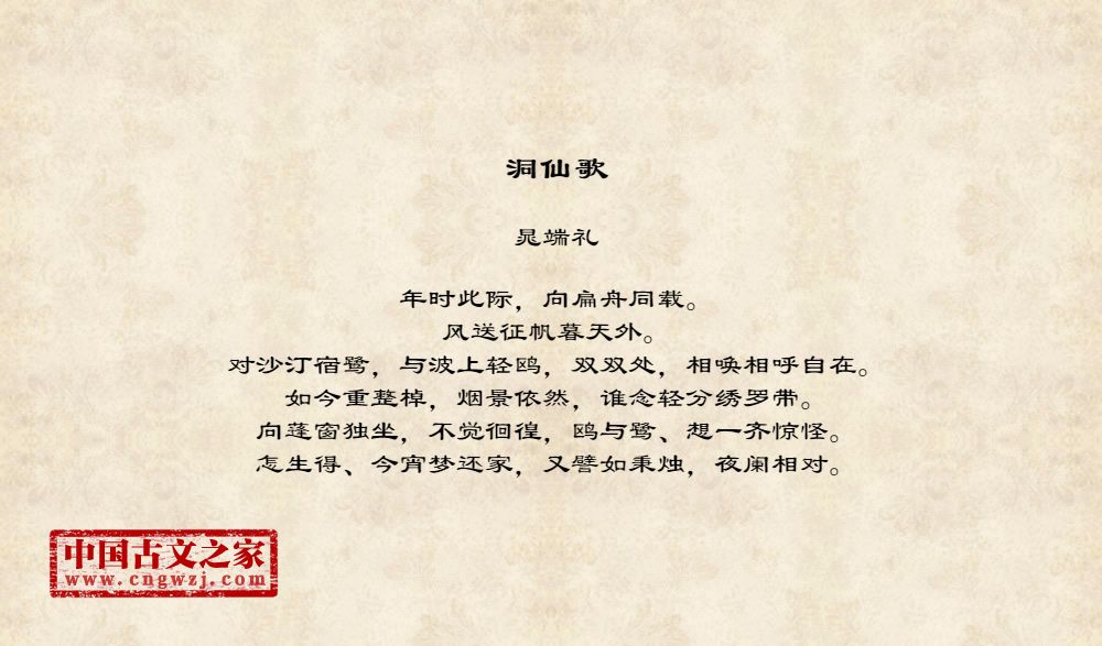 年时此际,向扁舟同载。风送征帆暮天外。对沙汀宿鹭,与波上轻鸥,双双处,相唤相呼自在。如今重整棹,烟景依然,谁念轻分绣罗带。向蓬窗独坐,不觉徊徨,鸥与鹭、想一齐惊怪。怎生得、今宵梦还家,又譬如秉烛,夜阑相对。