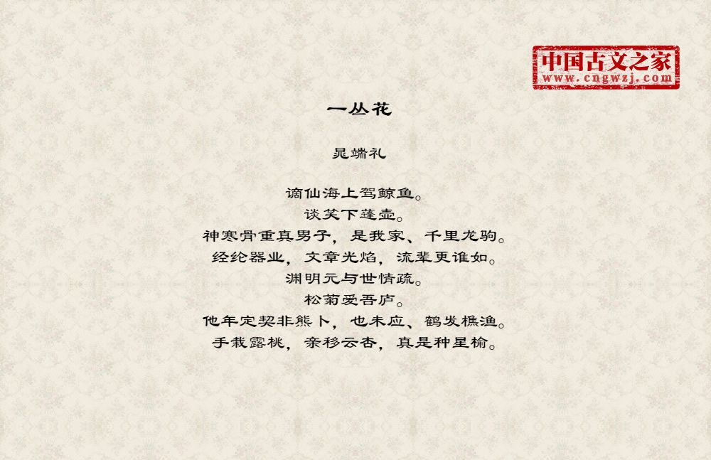 谪仙海上驾鲸鱼。谈笑下蓬壶。神寒骨重真男子,是我家、千里龙驹。经纶器业,文章光焰,流辈更谁如。渊明元与世情疏。松菊爱吾庐。他年定契非熊卜,也未应、鹤发樵渔。手栽露桃,亲移云杏,真是种星榆。