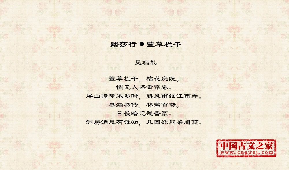 萱草栏干,榴花庭院。悄无人语重帘卷。屏山掩梦不多时,斜风雨细江南岸。昼漏初传,林莺百啭。日长暗记残香篆。洞房消息有谁知,几回欲问梁间燕。