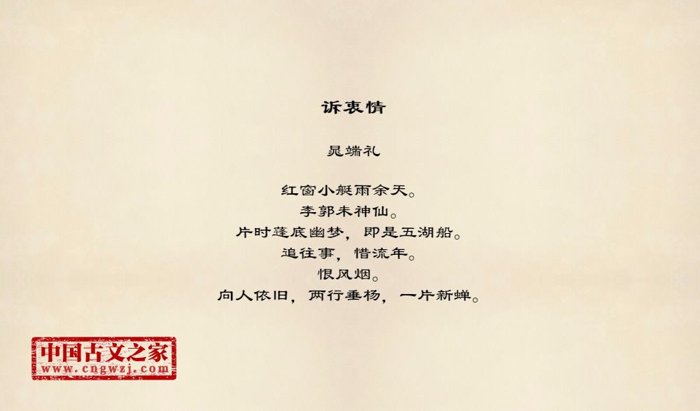 红窗小艇雨余天。李郭未神仙。片时蓬底幽梦,即是五湖船。追往事,惜流年。恨风烟。向人依旧,两行垂杨,一片新蝉。