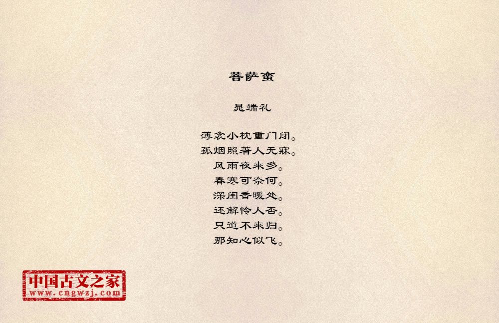 薄衾小枕重门闭。孤烟照著人无寐。风雨夜来多。春寒可奈何。深闺香暖处。还解怜人否。只道不来归。那知心似飞。