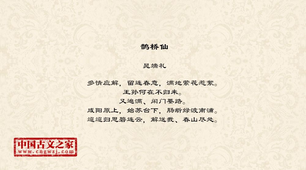 多情应解,留连春意,满地萦花惹絮。王孙何在不归来。又遍满、闲门要路。咸阳原上,始苏台下,肠断绿波南浦。迢迢归思碧连云,解送我、春山尽处。