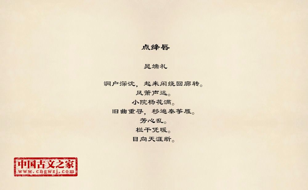 洞户深沈,起来闲绕回廊转。凤箫声远。小院杨花满。旧曲重寻,移遍秦筝雁。芳心乱。栏干凭暖。目向天涯断。