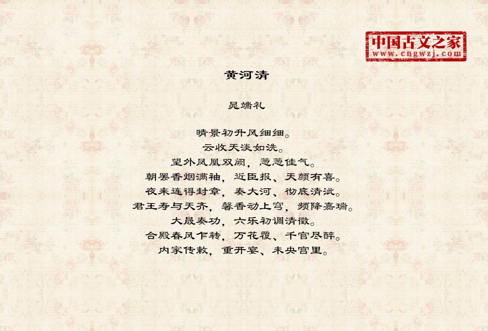 晴景初升风细细。云收天淡如洗。望外凤凰双阙,葱葱佳气。朝罢香烟满袖,近臣报、天颜有喜。夜来连得封章,奏大河、彻底清泚。君王寿与天齐,馨香动上穹,频降嘉瑞。大晟奏功,六乐初调清徵。合殿春风乍转,万花覆、千官尽醉。内家传敕,重开宴、未央宫里。