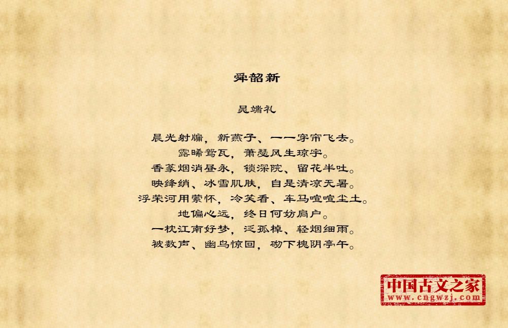 晨光射牖,新燕子、一一穿帘飞去。露晞鸳瓦,萧瑟风生琼宇。香篆烟消昼永,锁深院、留花半吐。映绛绡、冰雪肌肤,自是清凉无暑。浮荣河用萦怀,冷笑看、车马喧喧尘土。地偏心远,终日何妨扃户。一枕江南好梦,泛孤棹、轻烟细雨。被数声、幽鸟惊回,砌下槐阴亭午。
