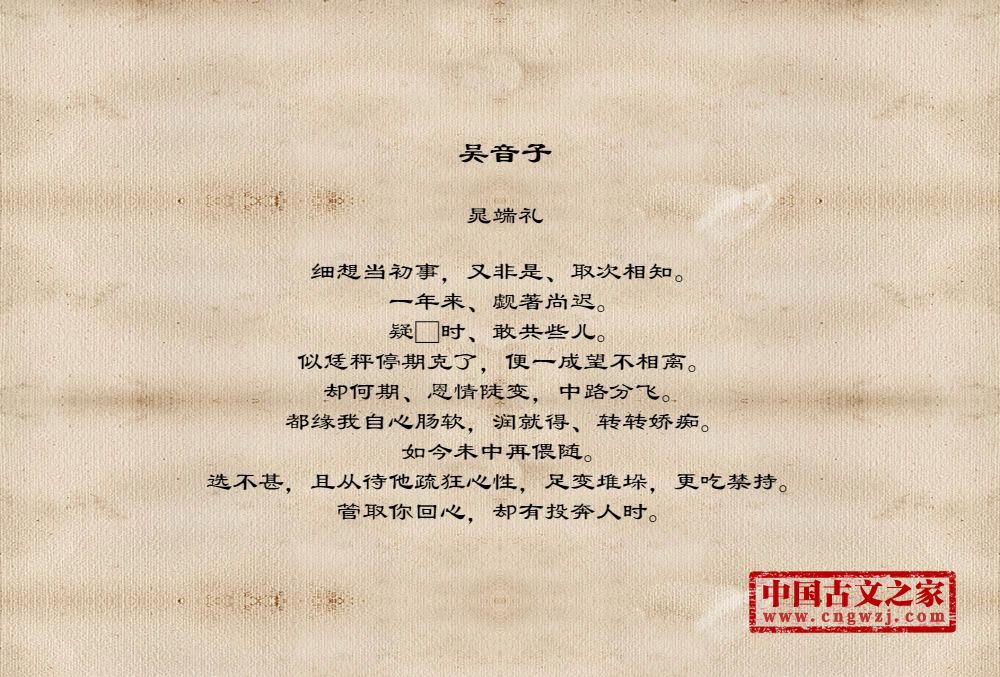 细想当初事,又非是、取次相知。一年来、觑著尚迟。疑□时、敢共些儿。似恁秤停期克了,便一成望不相离。却何期、恩情陡变,中路分飞。都缘我自心肠软,润就得、转转娇痴。如今未中再偎随。选不甚,且从待他疏狂心性,足变堆垛,更吃禁持。管取你回心,却有投奔人时。
